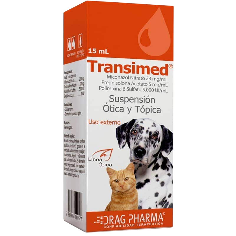 Transimed® se indica en el tratamiento de otitis externas y dermatitis causadas por hongos, levaduras y bacterias Gram (-).
